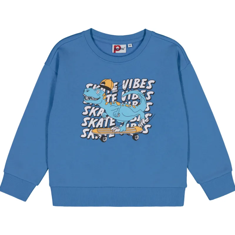 Resorit pyöreässä pääntiessä, hihansuissa sekä helmassa. Edessä Dino skate-printti, väri sininen/monivärinen.