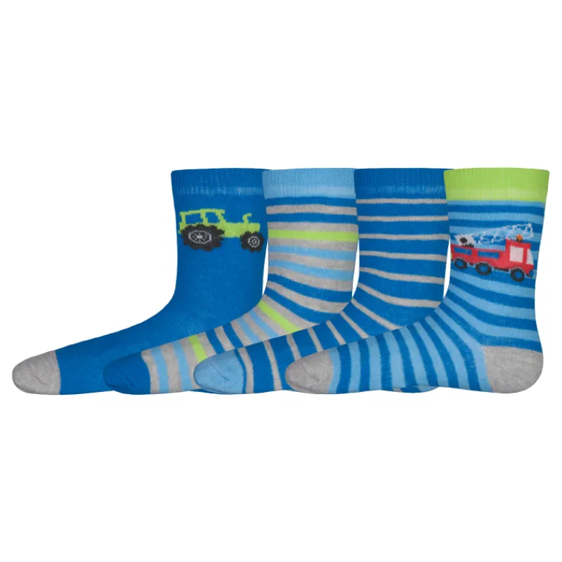 Pienten lasten nilkkasukat puuvillasekoitetta, neljän parin pakkaus. Paloauto-, traktori- ja raitakuviointi.