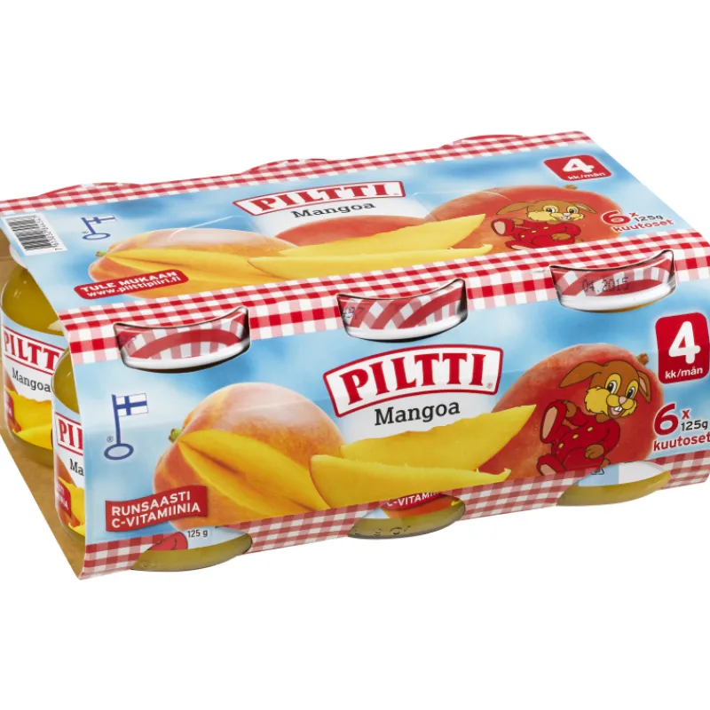 Piltti Mangoa -hedelmäsose on tehty herkullisesta mangosta. Sokeroimaton sose sisältää runsaasti C-vitamiinia. Pakkaus sisältää 6 sosepurkkia.