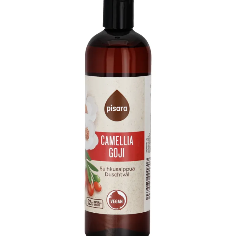 Pisara Vegan Camellia Oil & Goji -suihkusaippua tuo miellyttävää puhtautta ja ihanaa tuoksua suihkuhetkiin. Vegaanisen suihkusaippuan koostumus sisältää goji-uutetta ja kameliaöljyä, jotka yhdessä auttavat hellimään ihoa.