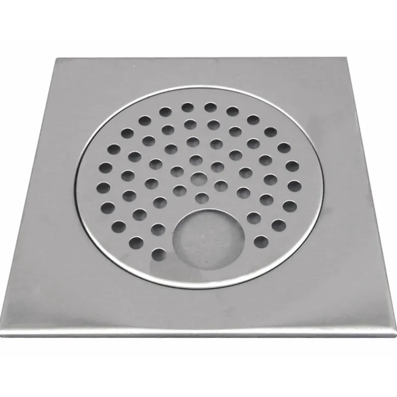 Ruostumattomasta teräksestä valmistettu lattiakaivon kansi, kiiltävä pinta, putkiaukollinen malli.