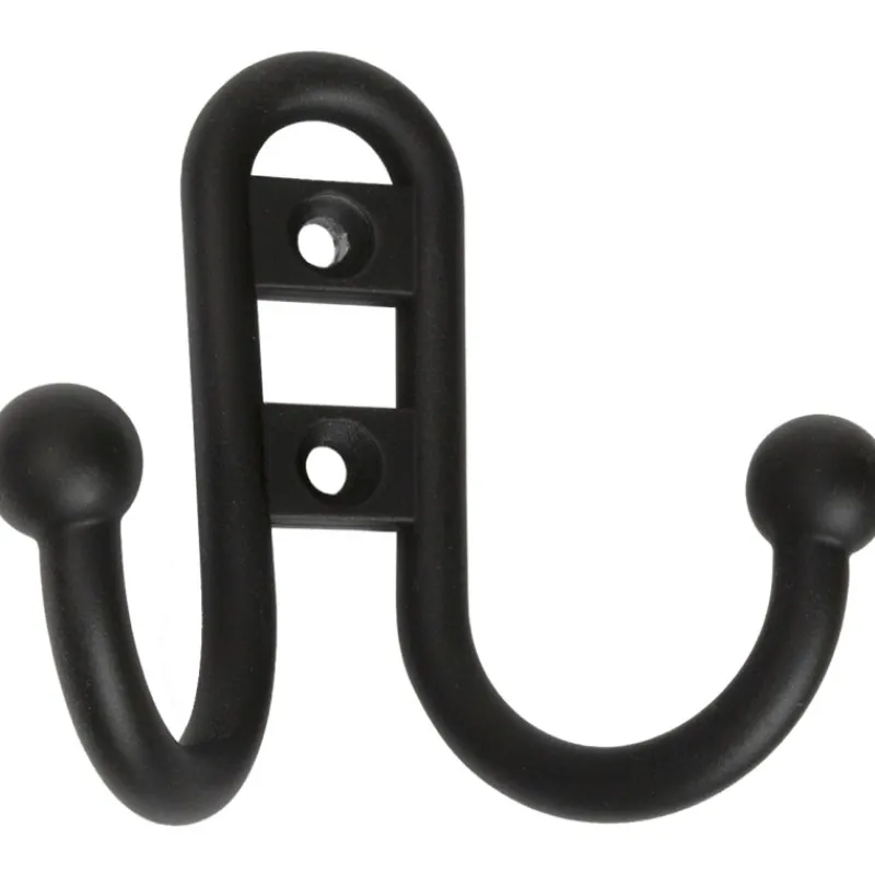 Kaarevalinjainen, kaksihaarainen vaatekoukku samakkia, väri musta. Koukku sopii esimerkiksi eteiseen tai vaatehuoneeseen. Koko 68 mm.