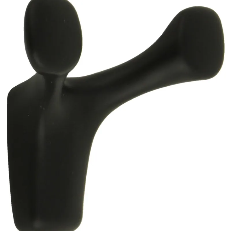 Modernisti muotoiltu kaksiosainen vaatekoukku, jossa on piilokiinnitys. Materiaali samakkia, joka on viiimeistelty mustaksi. Mitat: 80 x 35 x 65 mm.