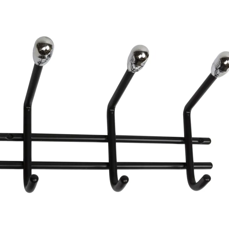 Kolmikoukkuinen musta teräksinen vaatenaulakko, jossa kromiset nupit. Mitat 25 x 5,5 x 14 cm. Pakkaus sisältää ruuvit.