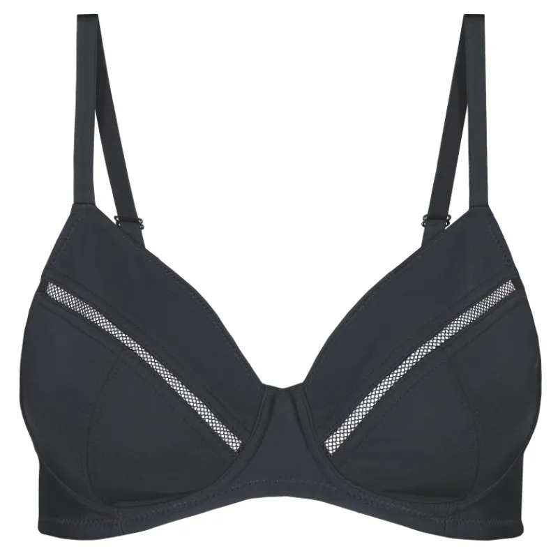 Sileää kuosia somistaa kuppien yläreunaa myötäilevä verkkopitsikaitale, väri musta.