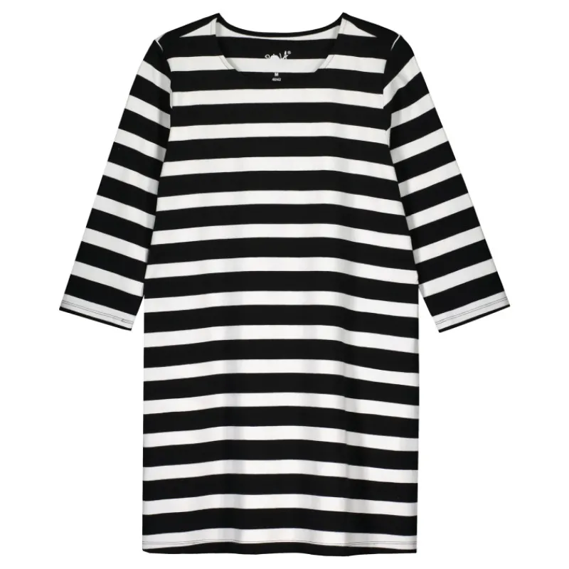 Raidallinen naisten tunika mukavaa puuvillasekoitetrikoota. Tunikan helmassa on rennot, sivusaumoihin upotetut taskut.