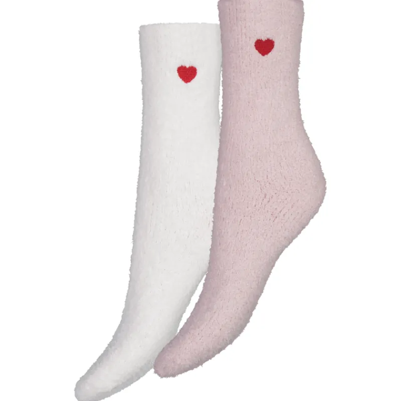 Naisten pehmosukat kevyttä, pörröistä neulosta, 2 pr/pkt. Sukkien varressa on brodeerattu sydän.
