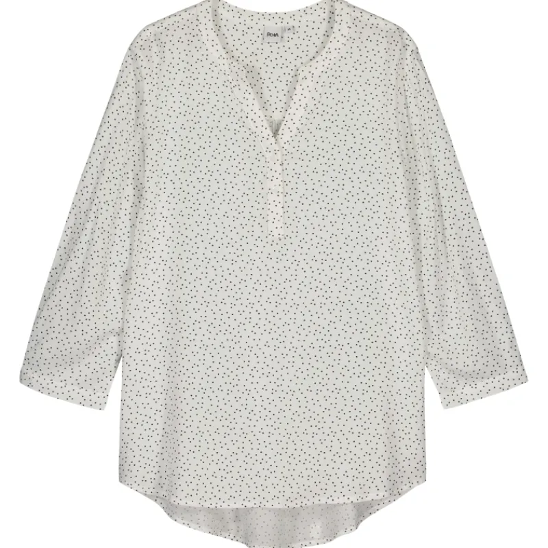 Naisten Pola Kelly-paita laskeutuvaa viskoosikangasta. Väljän mallisessa paidassa on valkoinen/musta pilkku-printtikuosi.