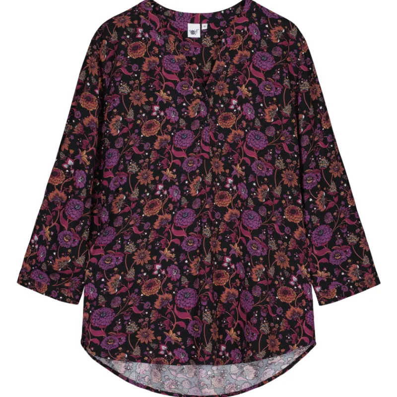 Kukkakuvioitu naisten paita laskeutuvaa viskoosikangasta. Paljon kokoja, isoin koko 3XL (56/58).