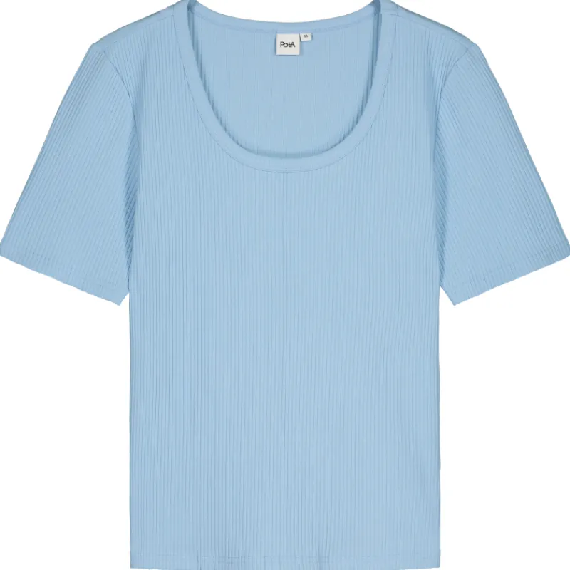 Naisten Pola Jemina-trikoopaita ribbi-kuosilla. Trikoopaidassa on pyöreä pääntie kangasresorilla ja lyhyet hihat. Väri yksivärinen vaaleansininen.