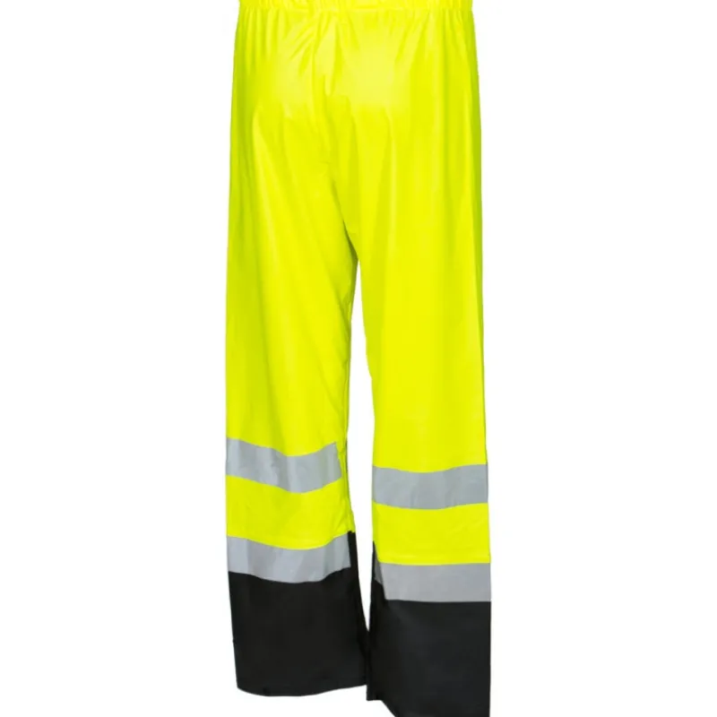 Huomioväriset sadehousut. Materiaali: 100% kudottua polyesteriä, jossa polyuretaanipinnoite. Materiaalin vedenpitävyys ja hengittävyys 5000/5000. Joustava, kevyt, pehmeä ja ei kahise. Saumat ovat teipattu ja ommeltu. Vyötärön säätö narulla. Lahkeissa nepparisäätö. EN ISO 20471 Lk.1.