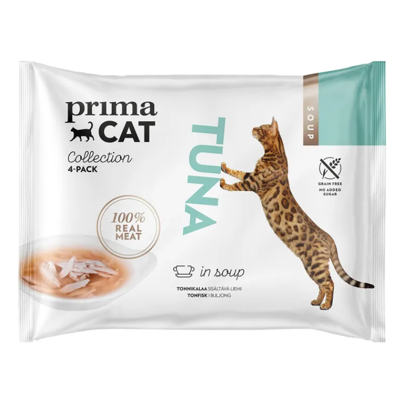 Keittomainen PrimaCat Soup -märkäruoka sisältää vain herkullista tonnikalaa, pienen määrän maukkaita äyriäisiä sekä makoisaa nestettä.