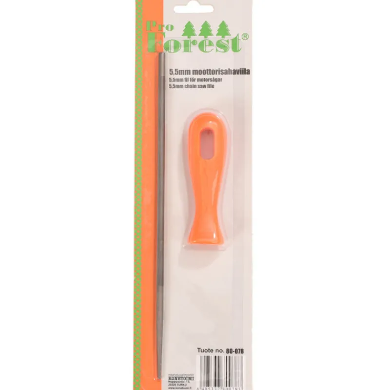 Käytännöllinen ja laadukas ProForest 5,5 mm viila sekä viilanpää moottorisahan ketjun teroitukseen. Soveltuu 3/8 (1,5 mm) teräketjuille sekä raivausterille.