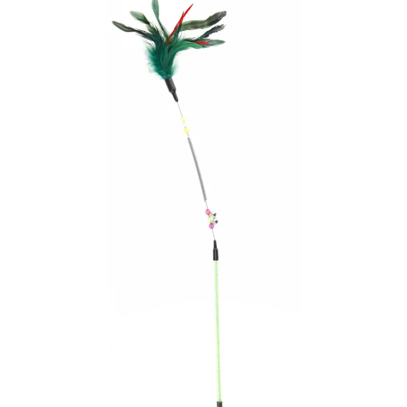 Real Cat -kissanhuiska taipuisalla jousivarrella. Jousihuiskan värikäs höyhentöyhtö sekä varren kulkuset ja helmet herättävät kissan mielenkiinnon.