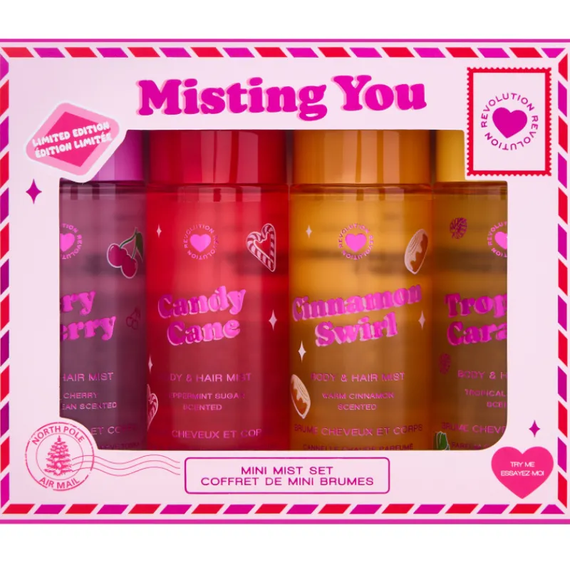 I Heart Revolution Mini -vartalotuoksusetin neljä herkullista tuoksua ovat kuin makea seikkailu. Pakkaus sisältää Very Cherry, Candy Cane, Cinnamon Swirl ja Tropical Caramel -tuoksut, jotka tuovat karkkimaista ja pehmeää tuoksua sekä vartalolle että hiuksiin.