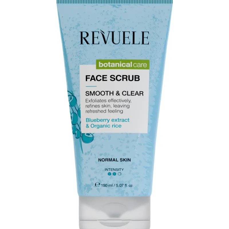 Nestemäinen Revuele Smooth & Clear -kuoriva puhdistusaine auttaa tekemään ihosta puhtaan ja pehmeän. Sisältää mustikkauutetta ja luomuriisiä.