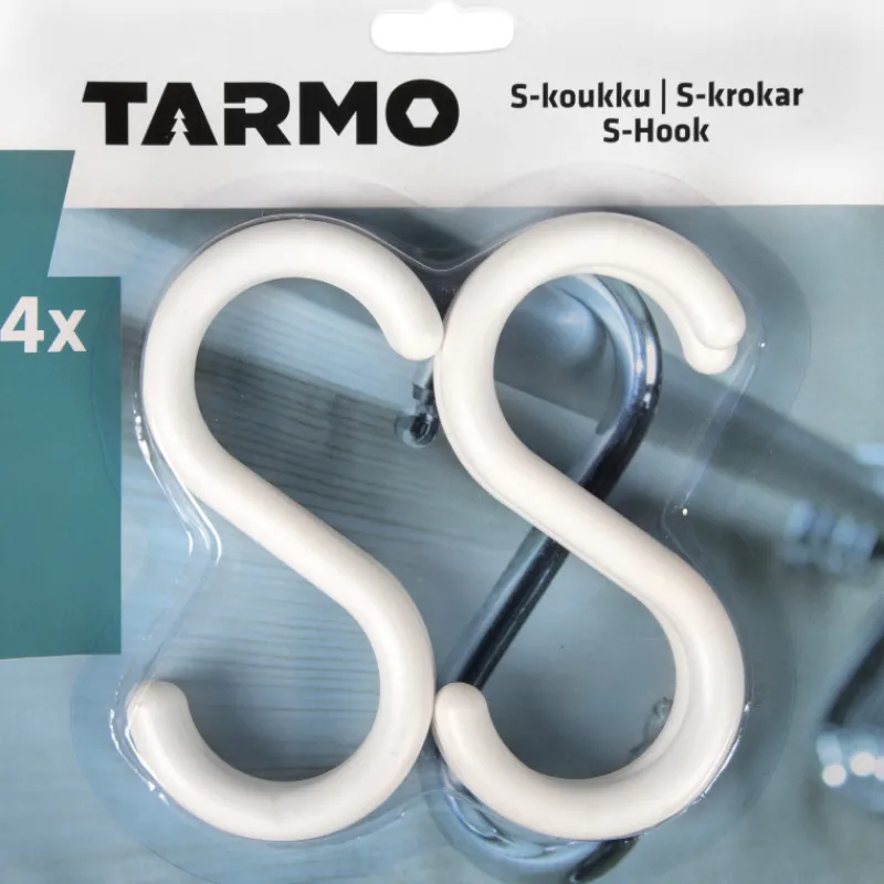4 kpl muovisia S-koukkuja monenlaiseen ripustamiseen. Koukkujen pituus 11 cm.