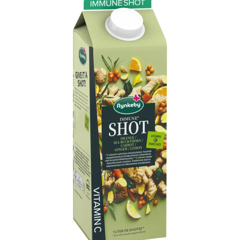 Miedon makuinen, inkivääriä sisältävä Rynkeby appelsiini-tyrni-porkkana-inkivääri-sitruunashottijuoma, jolla on hyvä aloittaa päivä. Makeuttamattomaan juomaan on lisätty C-vitamiinia. Jo 100 ml:ssa on 50 % päivittäisen C-vitamiinin saannin vertailuarvosta. Litran pakkauksesta voi nauttia 16 shottia (60 ml).