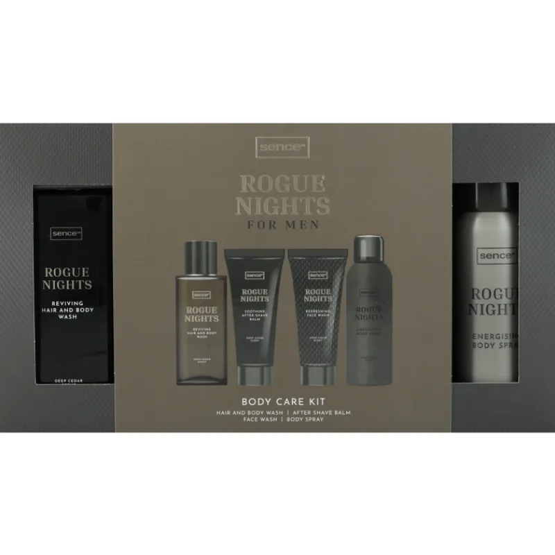 Pakkaus sisältää: Luxe Rogue Nights -suihkugeelin (100 ml), Luxe Rogue Nights -kasvojen pesuaineen (100 ml), Luxe Rogue Night -vartalosuihkeen (100 ml) ja Luxe Rogue Night -partaveden (100 ml).