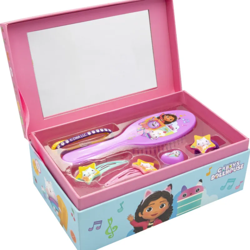 Kaunis Gabby’s Dollhouse -korurasia, jossa on peili, pitää korut tallessa. Setti sisältää hiusharjan, 3 kpl hiuslenkkejä, 2 kpl hiuspinnejä ja sormuksen.