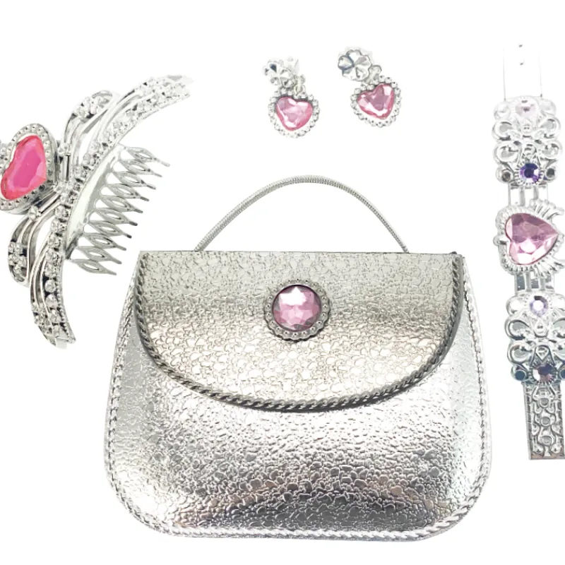 Kaunis laukku- ja korusetti lasten leikkeihin. Pakkaus sisältää yhteensä 5 osaa: laukun ja koruja.