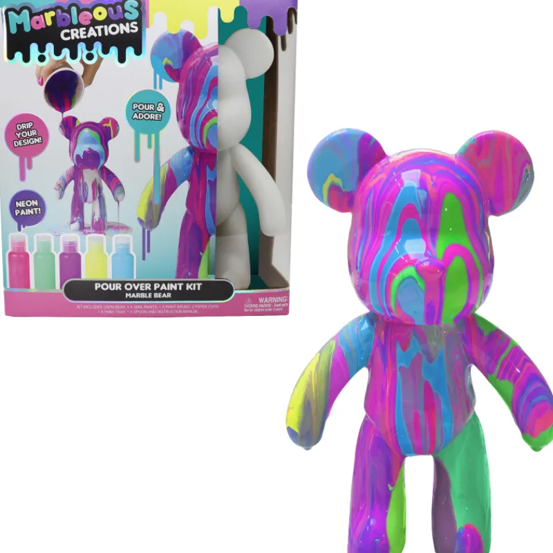 Luo oma uniikki taideteos! Muuta tavallinen nallefiguuri marmoroiduksi taideteokseksi kaatamalla sen ylle upea maalipinta. Pakkaus sisältää 23 cm nallen, viisi 60 ml maalia, tarvikkeet ja ohjeet. Hauska setti sopii kaiken tasoisille taiteilijoille.