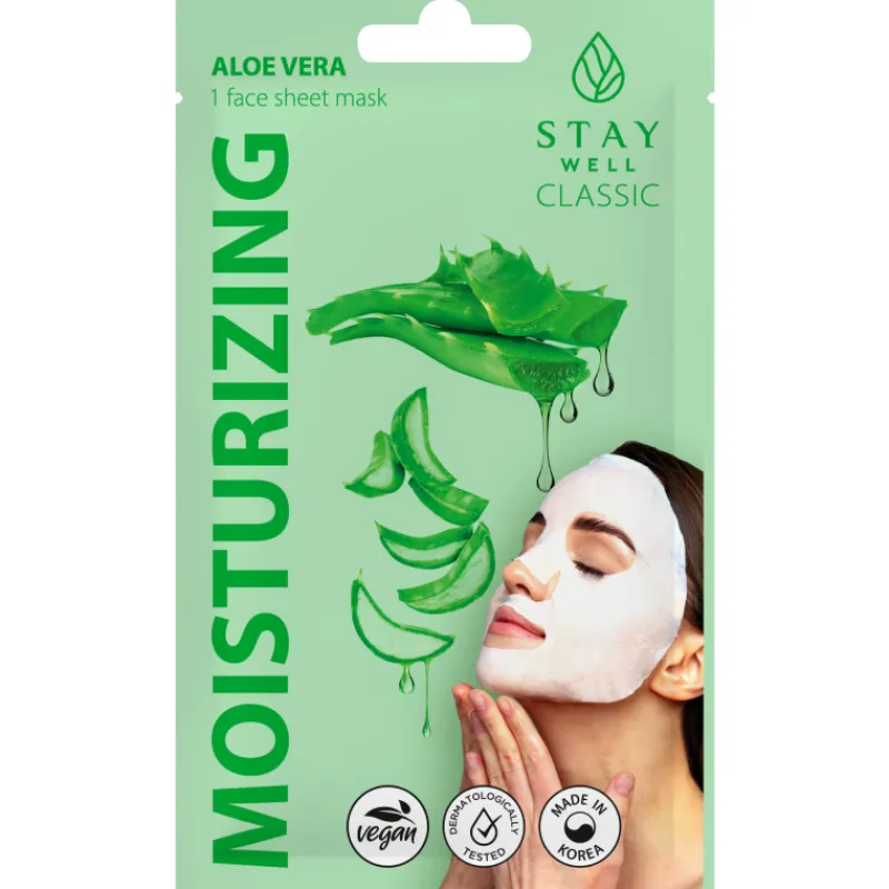 STAY Well Classic Mask Aloe Moisturizing -vegaaninen kangasnaamio on tehokas ihoa rauhoittava ja kosteuttava kotihoito kasvoille. Kertakäyttöinen naamio antaa iholle pehmeyttä ja kosteutusta nopeasti. Naamion pääainesosa aloe auttaa lievittämään mahdollista punoitusta ja ihoärsytystä. Naamion jälkeen iho on pehmeä, kosteutettu ja tasapainoinen. Sopii kaikille ihotyypeille.
