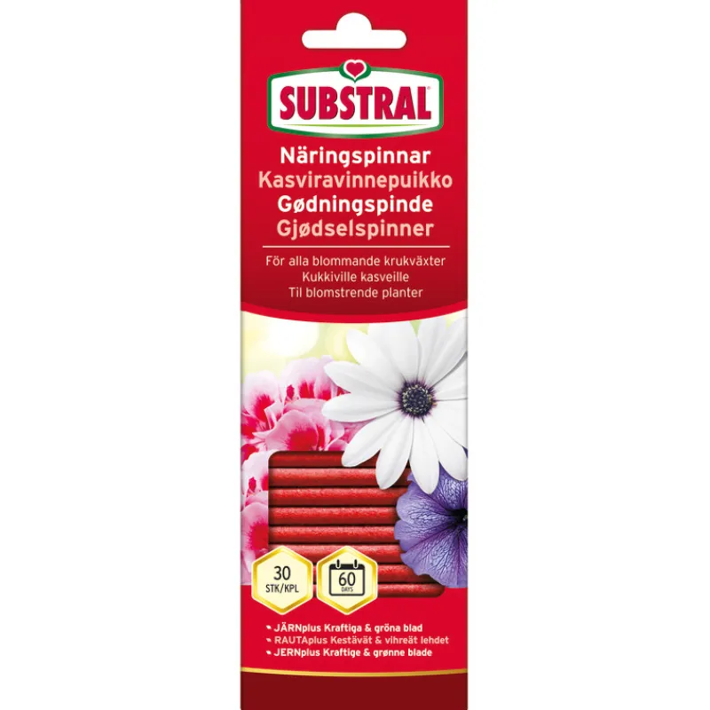 Substral Kasviravinnepuikoilla ravitset kasvit helposti ja vaivattomasti. Puikot ravitsevat ja antavat elinvoimaa kasveille tasaisesti kahden kuukauden ajan. Substral Kasviravinnepuikot kukkiville kasveille sisältävät yhdistelmän arvokkaita pääravinteita ja hivenravinteita. Terve kasvi on puolustuskykyisempi tuholaisia ja tauteja vastaan.