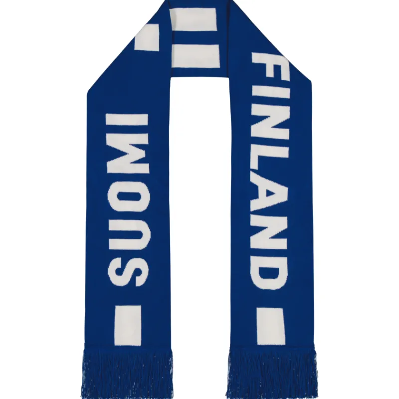 Sinistä kuosia somistaa valkoiset Suomi-aiheiset detaljit.