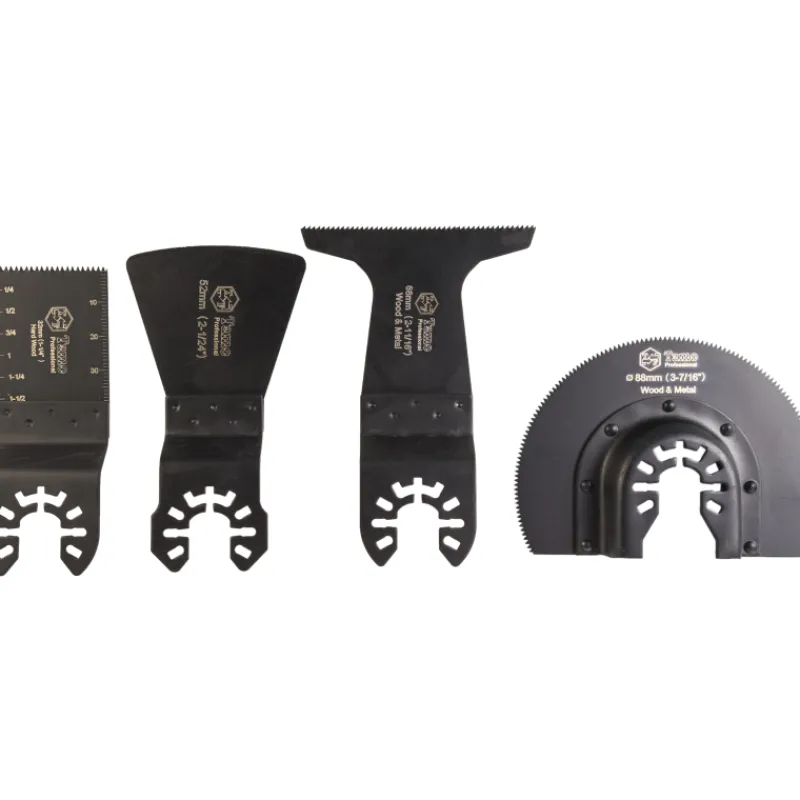 Tamo Professional 4-osainen monitoimikoneen teräsarja. Setti sisältää upotusterät 32 mm ja 68 mm, puolipyöreän 88 mm terän sekä 52 mm kaavinterän.
