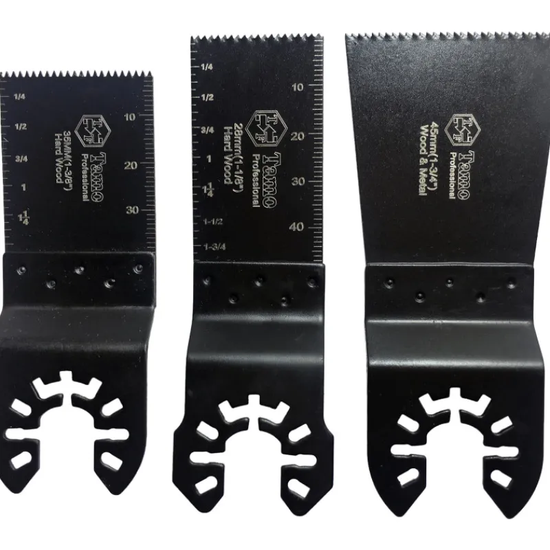 Tamo Professional 3-osainen monitoimikoneen teräsarja puulle ja metallille. Setti sisältää 35 mm Cr-V terän, 28 mm Cr-V terän ja 35 mm BiM terän.