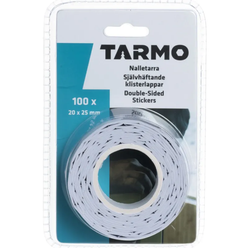 100 kpl 20 x 25 mm kaksipuolisia tarrapaloja. Kokonaispituus 250 cm. Helppokäyttöiset valmiiksi paloitellut tarrapalat monenlaiseen kiinnittämiseen.