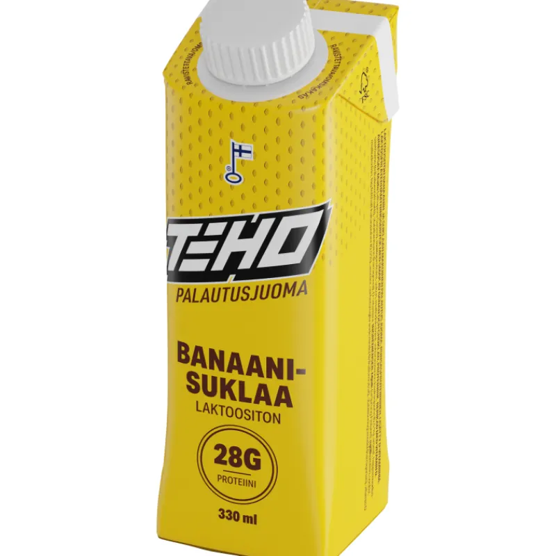 Banaani-suklaan makuinen Teho-palautusjuoma soveltuu voimaharjoittelusta palautumiseen tai välipalaksi. Se on valmistettu suomalaiseen lähimaitopohjaan. Juoma-annoksessa on 28 g proteiinia ja 8,6 g/dl hiilihydraatteja.