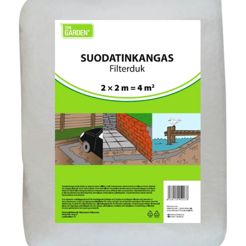 TokGarden-suodatinkangas pitää pohja- ja rakennusmaan erillään sekä estää maa-ainesten sekoittumisen ja kulkeutumisen rakenteisiin. Kangas läpäisee hyvin vettä ja ilmaa. Se on kemiallisesti neutraali ja kestää maassa esiintyviä happoja ja emäksiä. Käytä (N1)-luokiteltua kangasta kaikessa maarakentamisessa ehkäisemään routavaurioita. Käyttökohteita esim. piha- ja tilustiet, laatoitukset, laattakäytävät, piha-alueet, hiekka-alueet ja leikkipaikat. Suodatinkankaan käyttö säästää kaivuutyötä ja sora-aineksia. Materiaali polypropeeni. Paino 90 g/m². Suodatinkankaan koko on 2 x 2 m = 4 m².