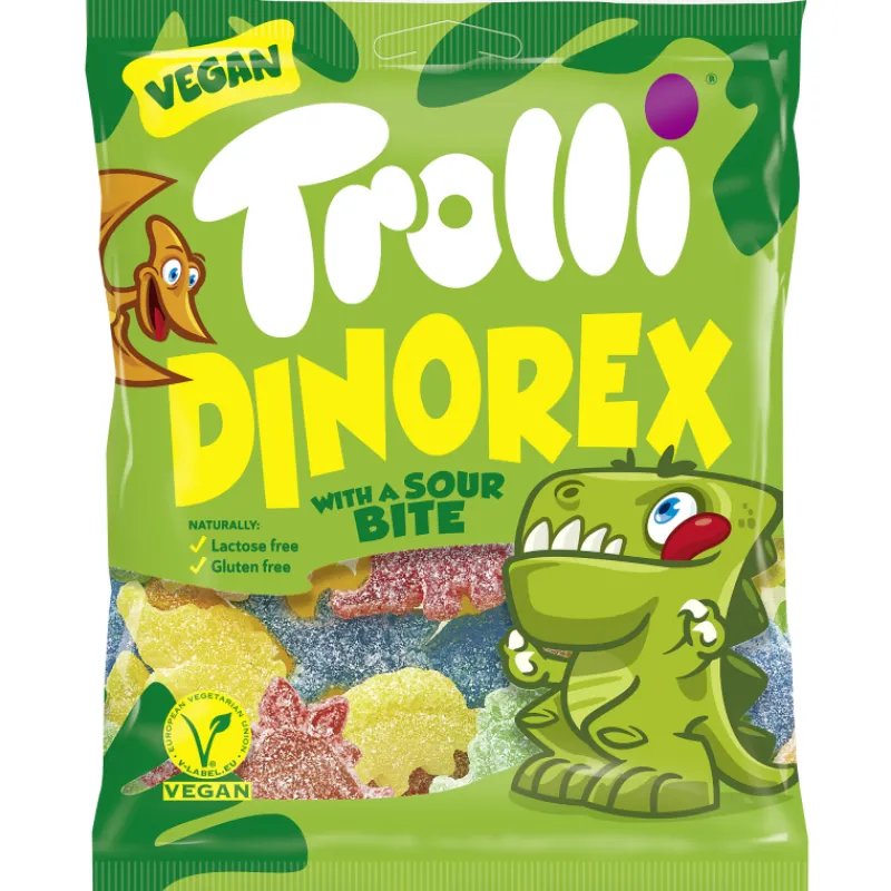 Värikäs ja kirpeä sekoitus dinosauruksen muotoisia karkkeja. Laktoositon, gluteeniton.