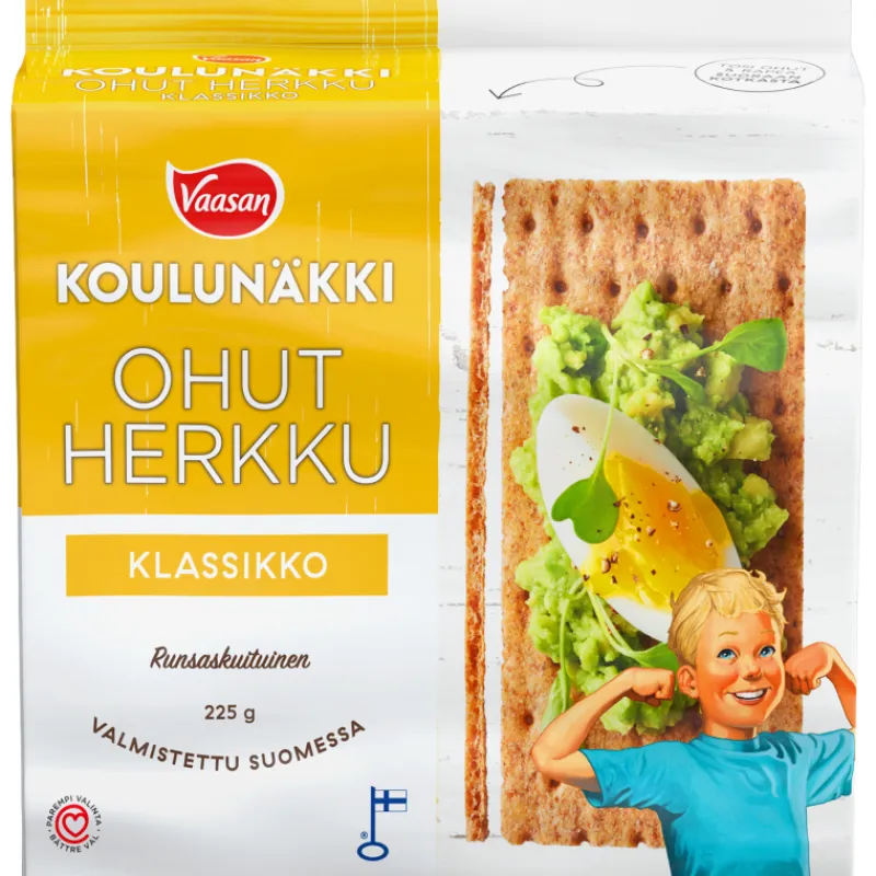 Perinteisestä Vaasan Koulunäkki-taikinasta valmistettu ohut herkku -näkkileipä on astetta kapeampi ja rapeampi. Sen herkullisen ohut koostumus on täynnä makua ja kuitua.