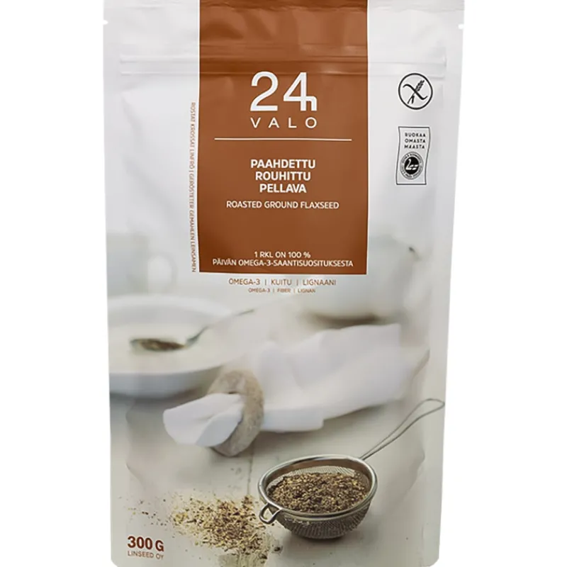 VALO24h rouhittu pellava on kasvatettu Suomessa, maailman pohjoisimmalla pellavanviljelyalueella. Kotimainen gluteeniton pellava sopii käytettäväksi sellaisenaan jogurttiin, rahkaan, smoothieen, puuroon, salaattiin, keittoon tai leivontaan. Päiväannos eli 1 ruokalusikallinen tarjoaa päivän omega-3-rasvahapot, runsaasti kuitua, magnesiumia, proteiinia ja lignaania. Paahdetussa pellavansiemenessä on herkullinen pähkinäinen maku. Rouhinnan ansiosta kaikki pellavan sisältämät tärkeät ravintoaineet imeytyvät helposti elimistön käyttöön.