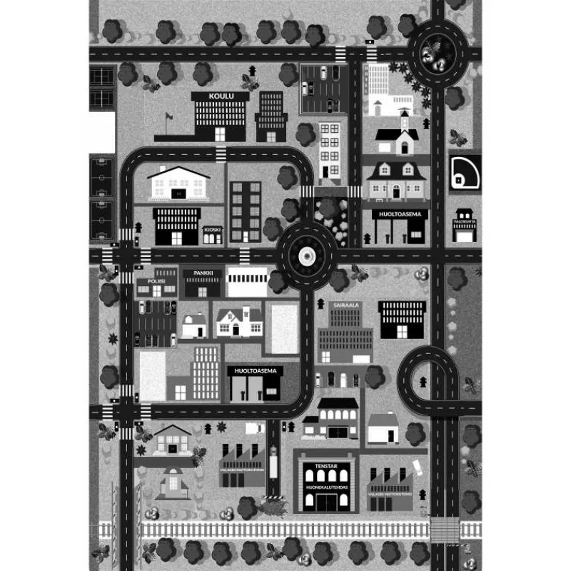 Turvallinen ja hauska kaupunkimatto, jonka suomenkieliset rakennusten nimet tutustuttavat pienetkin lapset aakkosiin leikin lomassa, ja joka sopii neutraalin värityksensä ansiosta monenlaisiin sisustustyyleihin.
