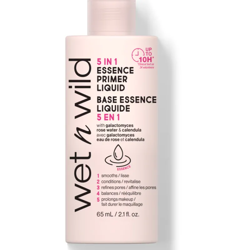 Wet N Wild 5-in-1 Essence Primer Liquid -meikinpohjustusaine on ihoa tasoittava ja hoitava meikinpohjustaja, joka saa meikin kestämään koko päivän kauniina. Koostumus sisältää kehäkukkauutetta, ruusuvettä ja Galactomyces Ferment -filtraattia, jotka yhdessä auttavat tekemään kauniin hehkuvan pohjan pitkäkestoiselle meikille.