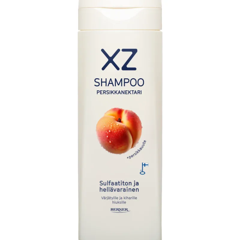 Kotimainen XZ Persikkanektari sulfaatiton shampoo on kehitetty erityisesti värjätyille hiuksille. Shampoo pesee hellävaraisesti hiukset ja samalla auttaa pidentämään hiusvärin kestoa. Shampoo hoitaa hiuksia ja on hellävarainen myös hiuspohjalle. Hiuksia on helpompi käsitellä märkinä. Shampoo tekee hiuksista pehmeän tuntuiset palauttaen niiden luonnollisen kiillon. Shampoo sisältää sitrusuutetta ja auringonkukansiemenöljyä. Ei sisällä silikonia. Pakkauskoko 250 ml.
