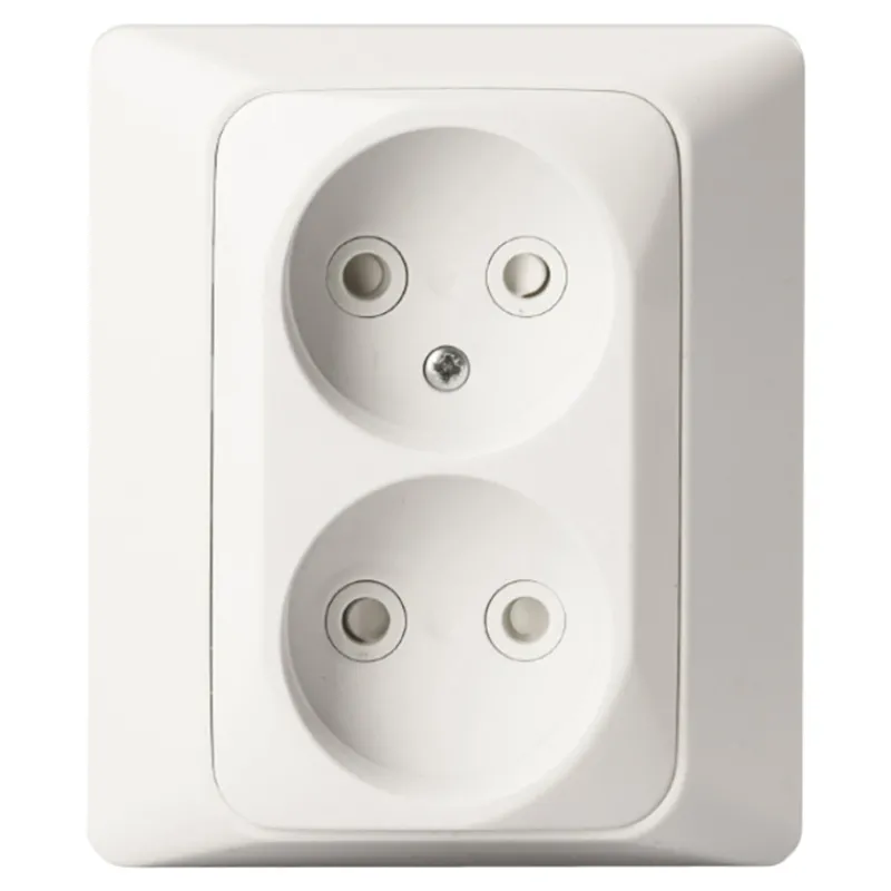 Maadoittamaton Jussi-kaksoispistorasia (0-luokka). Asennus vain kuiviin sisätiloihin kojerasiaan (maksimi 16A / 250V).