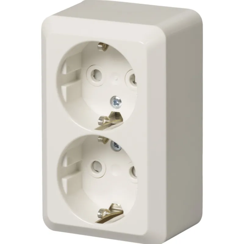 Pinta-asennettava 2-osainen Jussi-pistorasia. Mitat ovat 63 mm x 98 mm x 43 mm. Pistorasiassa on liittimet kutakin kosketinta kohden, ja niihin voi kytkeä maksimissaan neljä johtoa.
