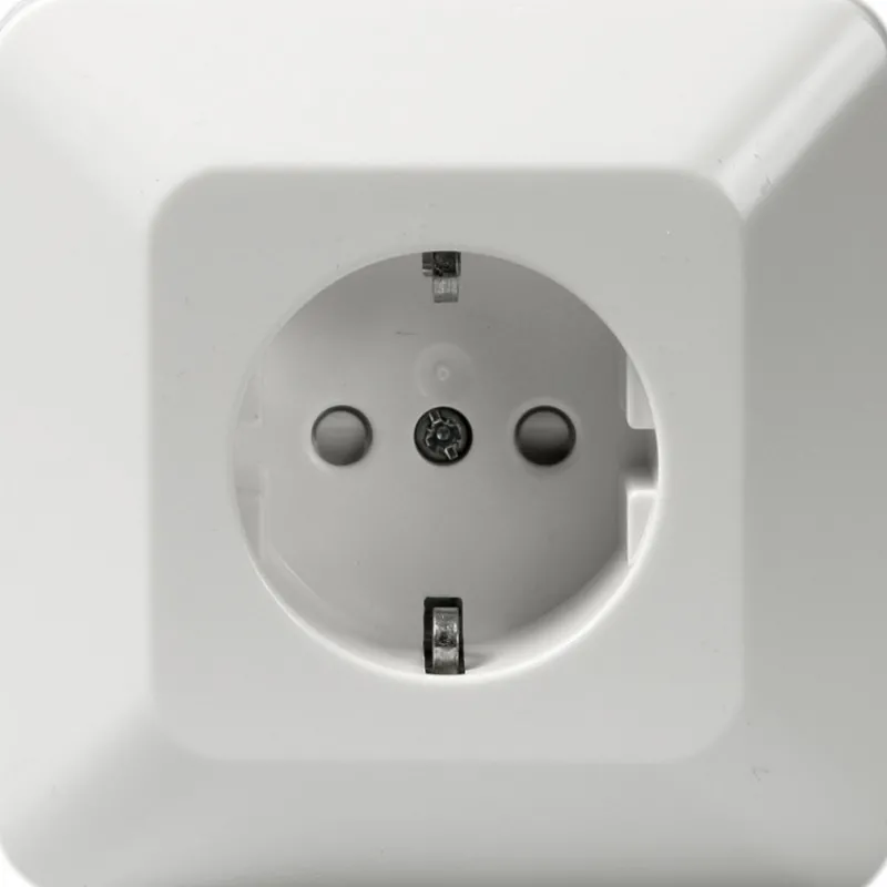 Upotettava yksiosainen Jussi pistorasia peitelevyllä. Liittimiin voi kytkeä maksimissaan kaksi johtoa.