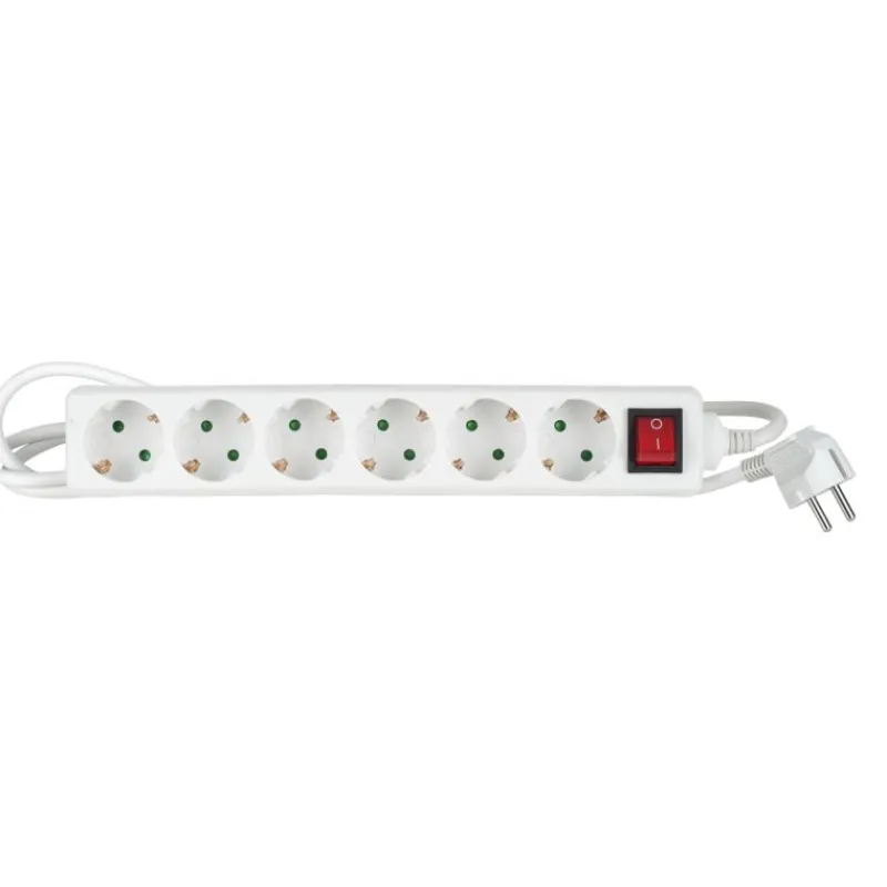 6-osainen jatkojohto+kytkin 3 m, kaapeli H05VV-F 3×1,5mm², väri valkoinen. Lapsisuojallinen tuote.