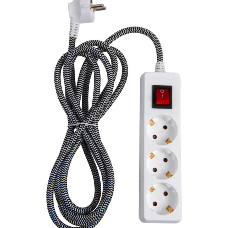 Mustavalkoisella kangasjohdolla ja on/off-kytkimellä varustettu 3-osainen jatkojohto sisäkäyttöön. Pistotulppa ja runko-osa valkoiset. Kotelointiluokka IP20. Johdon pituus 2 m. H05VV-F 3 x 1,5 mm².