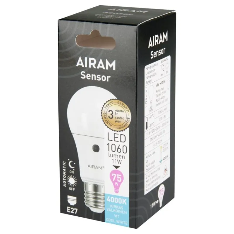 Sisäänrakennettu hämäräkytkin, Airam Sensor, syttyy automaattisesti kun valaistuksen taso laskee alle 15 luksiin. Vakiokupuinen LED-lamppu, teho 10,7 W, E27-kanta, valovirta 1060 lm ja värilämpötila kirkas valkoinen 4000K.