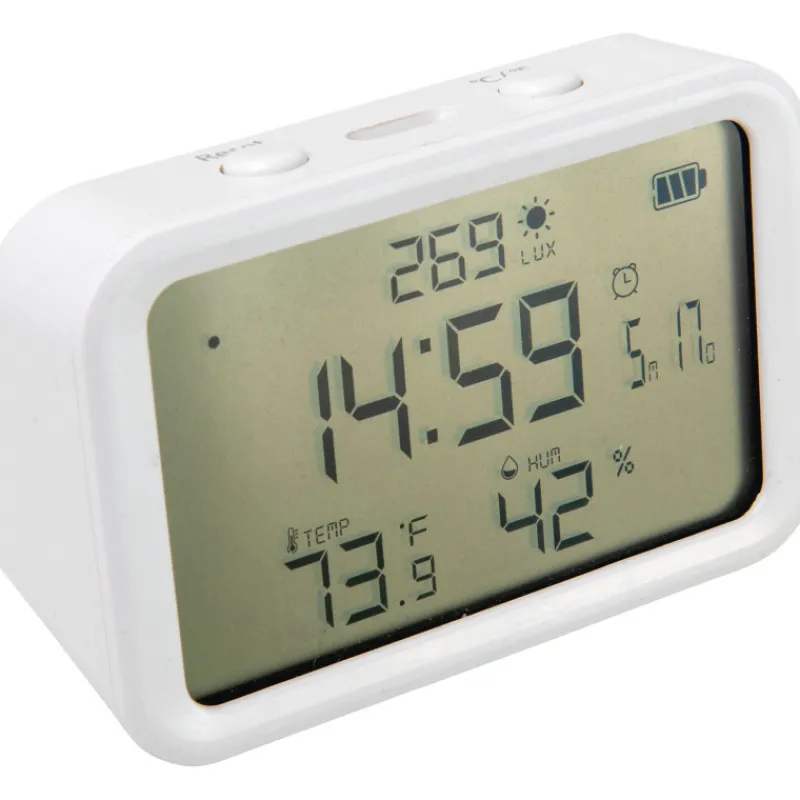 Airam SmartHome lämpötila- ja kosteusmittari. Yhdistä laite kotisi WiFi-verkkoon ja ohjaa helppokäyttöisellä SmartHome-sovelluksella. Laitteessa on kellotoiminto ja se mittaa myös valaistustasoa. Parita laite sovelluksessa toisen SmartHome-tuotteen kanssa ja luo laitteiden välille sääntöjä. Voit käyttää mittaria laukaisemaan muita toimintoja, kuten valojen syttymisen valaistustason laskiessa tai lämmittimen käynnistymisen lämpötilan laskiessa. Valotason tunnistusasteikko: 0 Lux ~ 157000 Lux. Käyttölämpötila: 0 ℃~ 60 ℃. Kosteuden mittausalue: 0 % ~ 100. Paristot 2 x AA, ei sisälly pakkaukseen. Tuotteen koko: 84 mm x 55 mm x 32 mm.