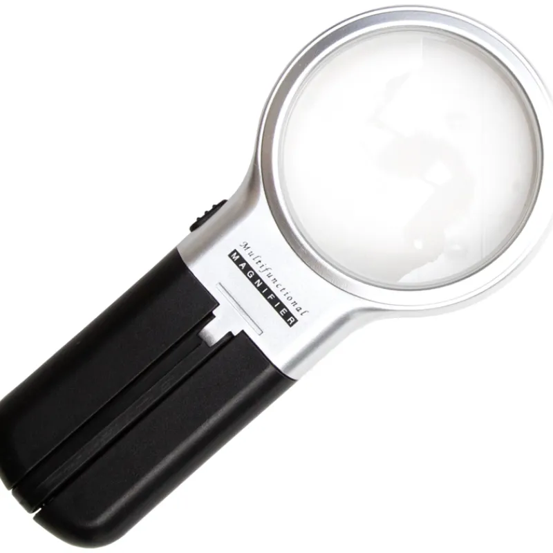 Suurennuslasissa LED-valo ja taittuva varsi.