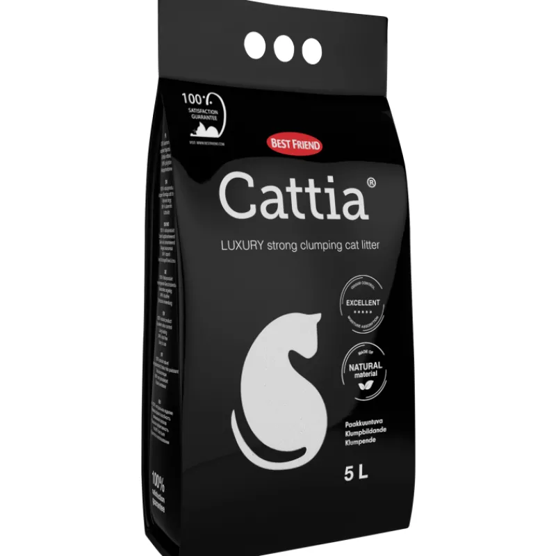 Cattia paakkuuntuva kissanhiekka on 100% luonnontuote. Ylivoimainen hajunsitomiskyky. Erittäin riittoisa ja helppohoitoinen. 99% pölytön. Pakkauskoko 5 L.