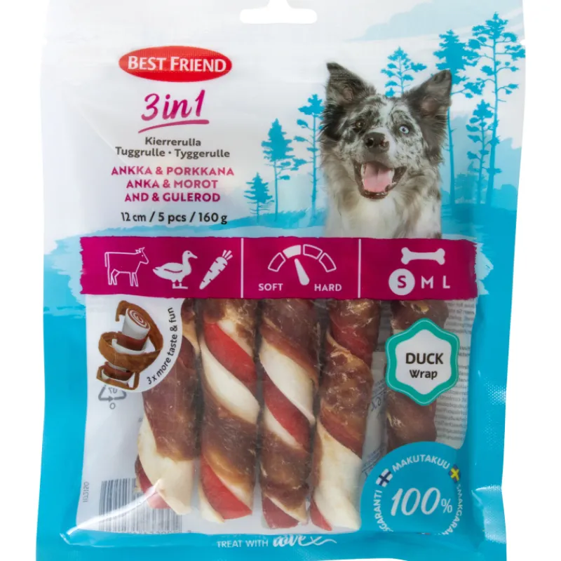 Best Friend 3in1 -kierrerulla on lihaisa puruluu, jossa on kolme herkullista makua yhdessä. Naudannahkainen kierrerulla sitkeällä porkkananmakuisella kasvistäytteellä, tarjoaa sopivan puruvastuksen vahvemmillekin leuoille. 3in1 puruluun vastustamaton ankkakierre kruunaa maukkaan puruelämyksen koirille. Tuote soveltuu mainiosti pienille ja keskikoisille koirille, sekä myös herkkuna suurille koirille.